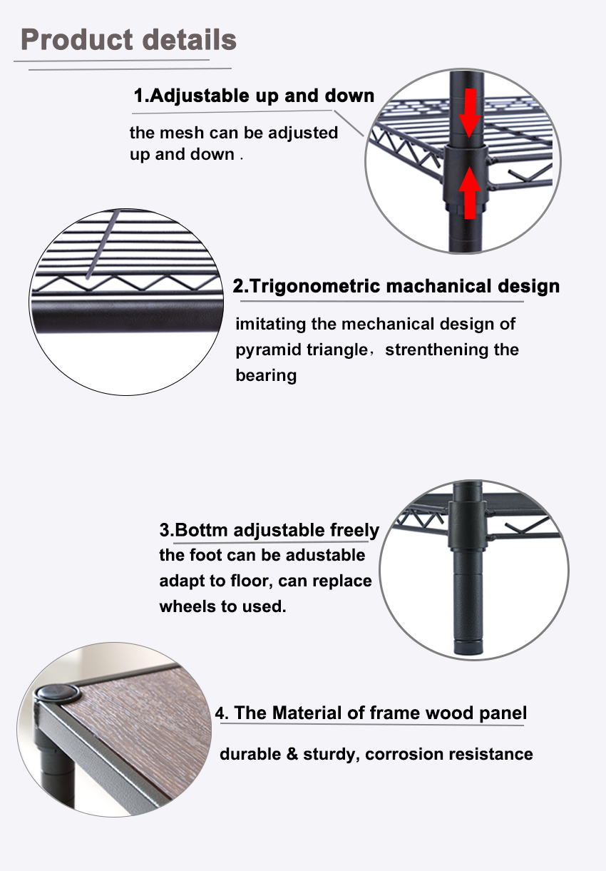 The 3-6 shelf metal rack can be used in living room and bedroom, For example , TV Stand shelving, hanging shelf、desk shelf、closet shelf、kitchen shelf、bathroom shelf and so on.